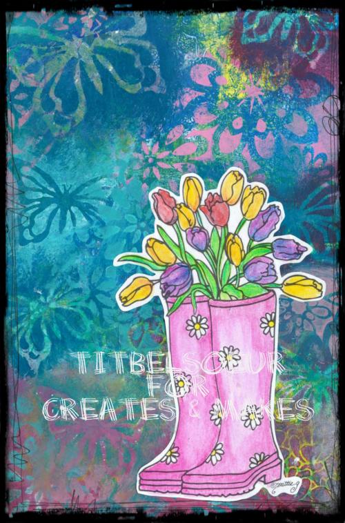 Et si tu préfères les avoir en photo plutôt qu'en réalité (oui, parce qu'à table c'est la petite-fille, pas les bottes) (enfin en même temps, tu fais ce que tu veux) (si t'as des bottes copines), tu peux toujours essayer de gagner de la zimage de chez Pattie en participant à notre challenge mensuel sur createsandmakes.blogspot.com, tu nous postes une zoulie réa sur le thème du printemps, c'est de saison, et hop ! une chance de gagner... Et une fois que tu as gagné ta zimage (note que tu peux en choisir une autre, hein) (t'es pas obligée de rester dans la chaussure), tu pourras faire un zouli tableau. Regarde, fastoche : tu fais ton fond en couches multiples, un peu comme un mille-feuille, sauf que les couches ne sont pas égales (non, sinon on voit pas ce qui est dessous, hein) (donc pas vraiment comme un mille-feuille) (oublie le mille-feuille), en gros tu prends tes pochoirs et tu passes de la couleur avec l'index, une fois claire une fois foncée, une fois foncé sur clair une fois clair sur foncé, puis on recommence mais pas au même endroit (ça va, tu me suis toujours ou je t'ai perdue ?) et hop ! vlà le tableau :