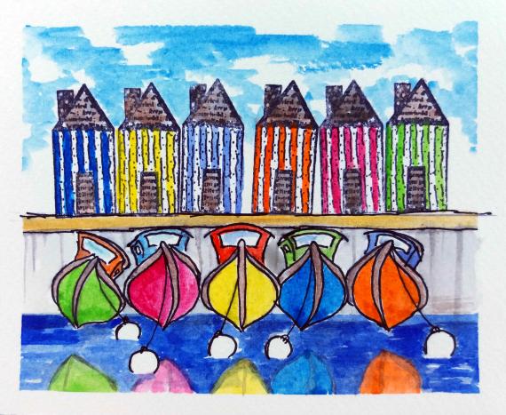 J'ai utilisé un tampon maison de la planche Home Sweet Home A5 © Kathleen Fullman de chez The Artistic Stamper pour faire le village, puis j'ai dessiné les bateaux, et j'ai aquarellé le tout. Oui, je me relance un peu dans le dessin ces temps-ci... une petite routine presque quotidienne... Que penses-tu de mes bateaux ?