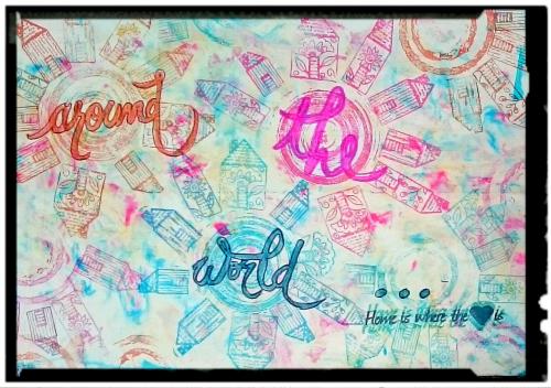 J'ai fait mon fond avec de la mousse à raser, c'était un test pour mes stagiaires de la résidence seniors (je t'en ai parlé ici : Façon Finnabair... adapté !) car oui, je fais plein de tests pour les amuser ! J'ai utilisé les cercles de la plaque Decay Journaling Stamps #1 Size A5 et les maisons de Home Sweet Home A5 © Kathleen Fullman Puis je me suis essayée à l'écriture, ça n'est pas trop mon truc mais je m'améliore...